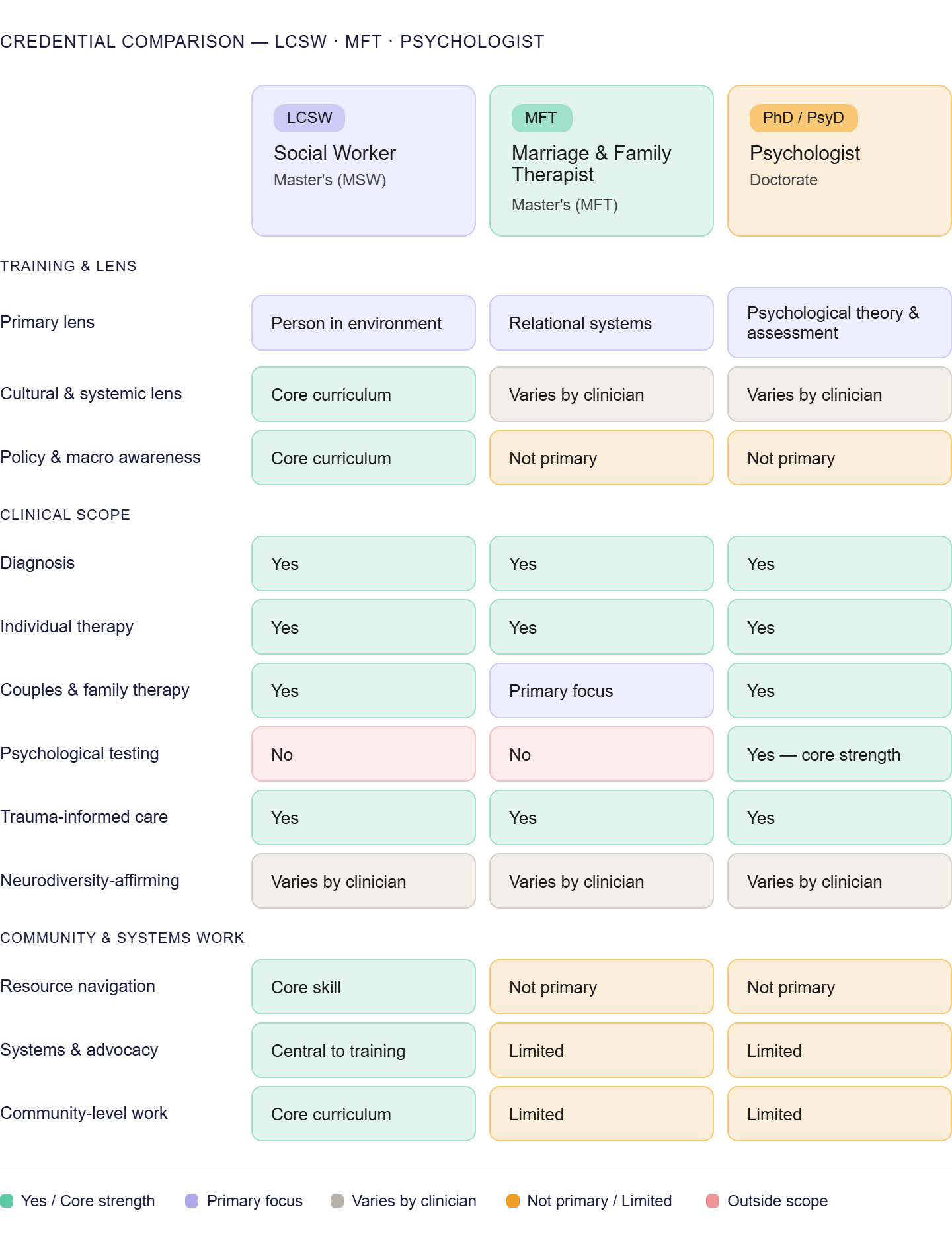It’s worth saying clearly: skilled clinicians across all three disciplines can and do excellent work. A talented MFT can hold cultural context beautifully. A psychologist can be a masterful trauma therapist. An LCSW can develop deep expertise in assessment.